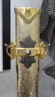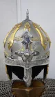 Каждый элемент доспеха изготовлен из благородных материалов и выполнен с максимальной тщательностью. Шлем, выполненный из сплава, украшен сложной резьбой, покрыт никелем и золотом высшей пробы (толщина 10 мкм), что придает ему неповторимый блеск. Меч, созданный из дамасской стали и украшенный натуральным камнем чароит, является символом мастерства и власти.